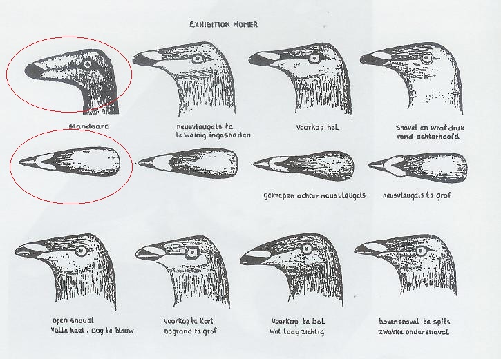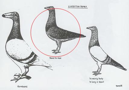 Het kenmerk bij uitstek van de Engelse Schoonheidspostduivenrassen is natuurlijk hun extreme kopbelijning. De meest markante kopbelijning in dit gezelschap behoort zonder twijfel toe aan de Exhibition Homer. Met zijn driehoekige horizontaal gedragen kop en opgerichte lichaamshouding is het een imposante vertegenwoordiger van de groep vormduiven.