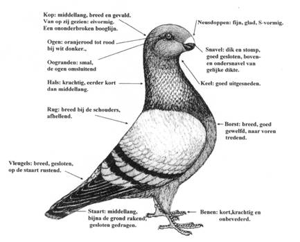 Na het algemeen voorkomen is de kopvorm met snavel en neusdoppen het meest van belang. Daarna volgt ogen en oogranden. Hierna is pas het type, de stand en de houding van belang, dit in tegenstelling tot vele rassen. Hierna volgt dan nog de bevedering en als laatste kleur en tekening.