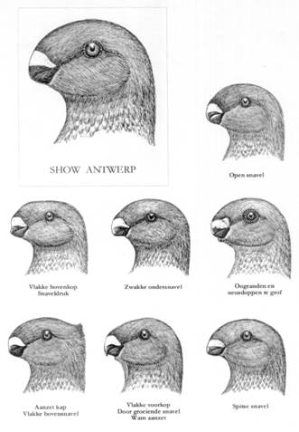 Wanneer de jonge Show Antwerps zijn opgegroeid moet de fokker wat geduld hebben bij het selecteren. Pas na een jaar is het type volledig uitgegroeid en is met name de kop volledig “gevuld”. Toch zijn er voor die tijd al de nodige fouten aan de kop te ontdekken. Zo is een te zwakke ondersnavel al snel waar te nemen, bovendien zal zo'n snavel niet goed sluiten en de bovensnavel vaak storend oversteken. Ook op wrat- en snaveldruk kan al snel geselecteerd worden. De kop kan in een vroeg stadium al herkenbaar te vlakke gedeelten in de voorkop vertonen. Vaak zien we dan een vlakke voorkop, met een sterk afhellende snavel. Ook te geronde koppen, dus terug naar het kortgezicht, komen regelmatig voor, maar wanneer deze vogels voldoende andere kwaliteiten bezitten kunnen ze worden aangehouden om, in combinatie met een juiste partner met b.v. een langere kop, voor nakomelingen met de juiste kopvorm te zorgen.